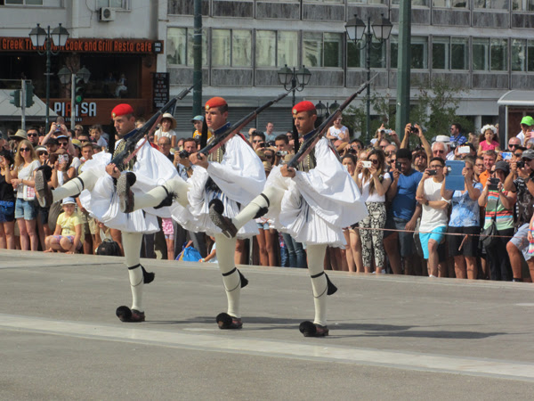 Dobbiamo tornare in albergo per una questione tecnica e poi via verso piazza Syntagma, arriviamo per le 10.20 e c'è già molta gente dietro al nastro per assistere al cambio della guardia: la domenica, alle 11.00, un intero plotone marcia su via Vasilissis Sofias fino al mausoleo accompagnato dalla fanfara. In realtà tutto inizia verso le 10.50 e per le 11.15 è già tutto finito, anche perchè durante la manifestazione la strada viene chiusa.